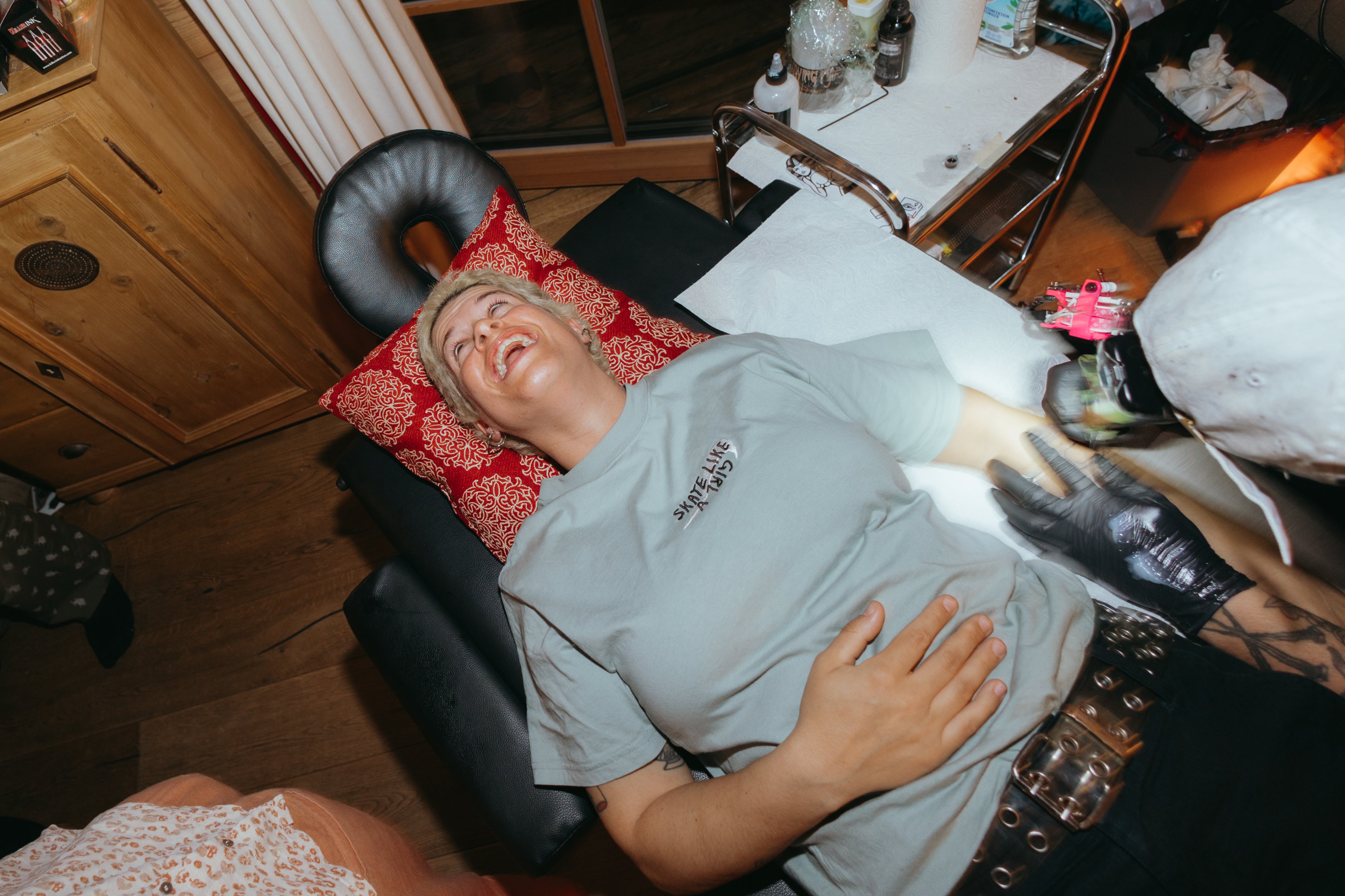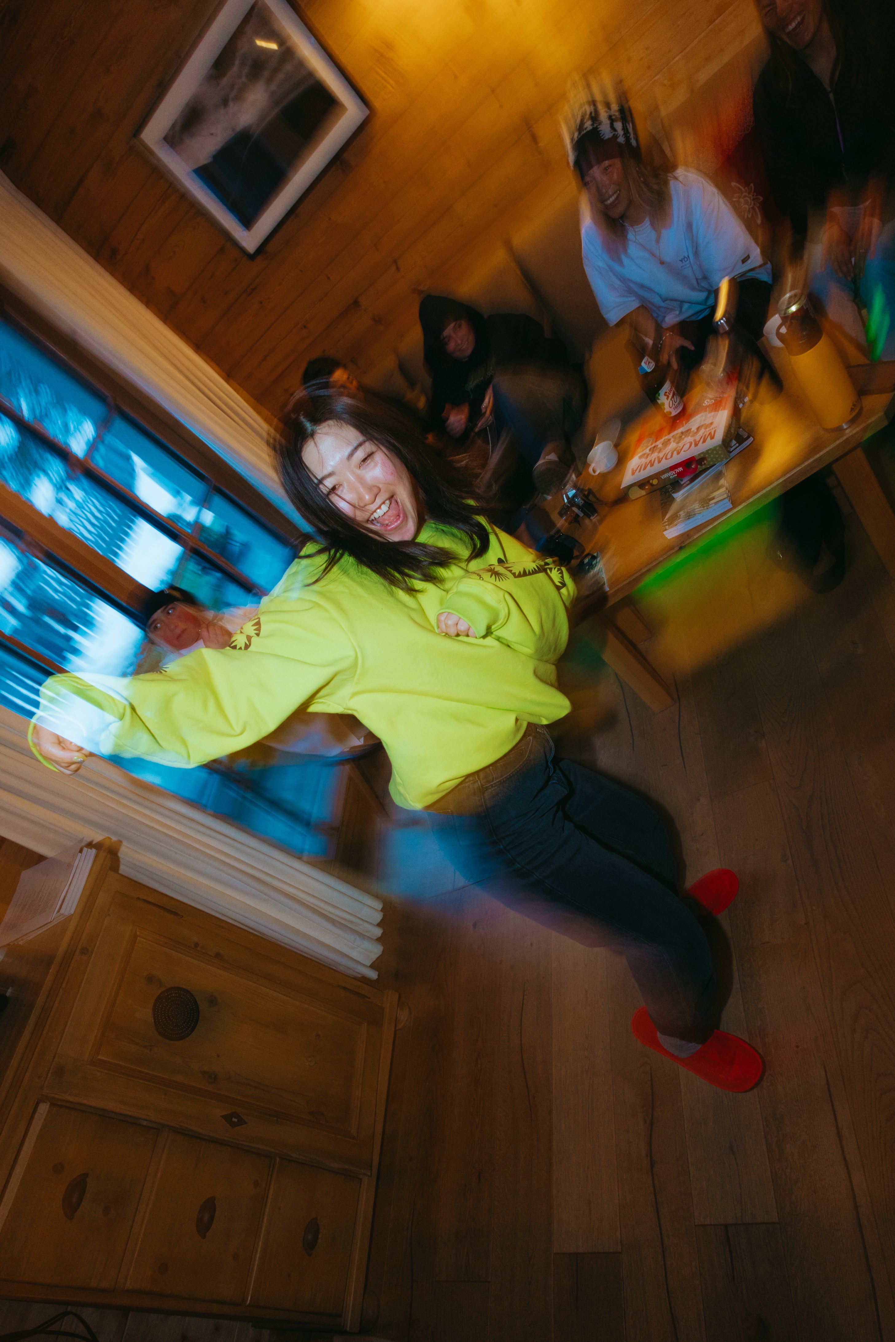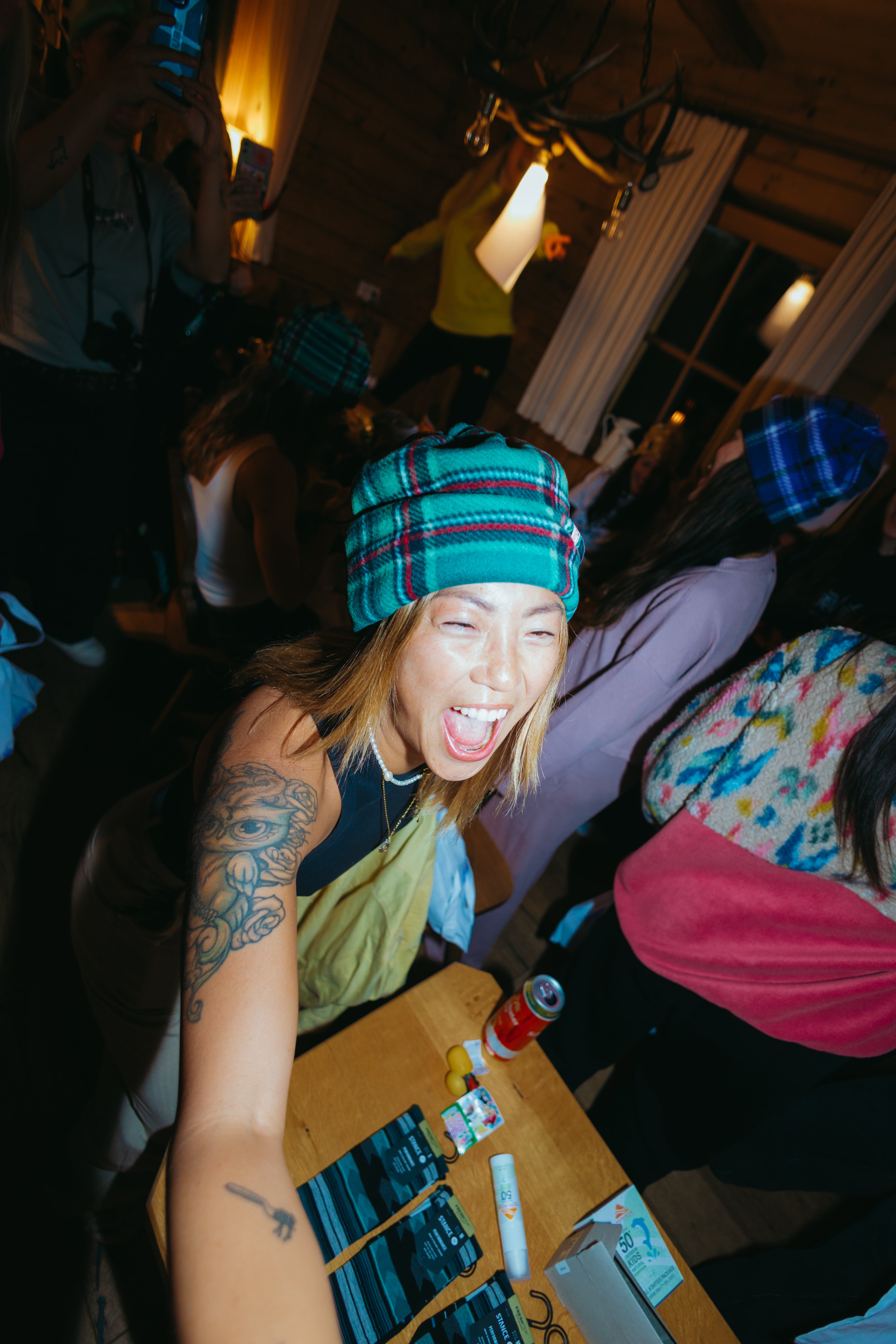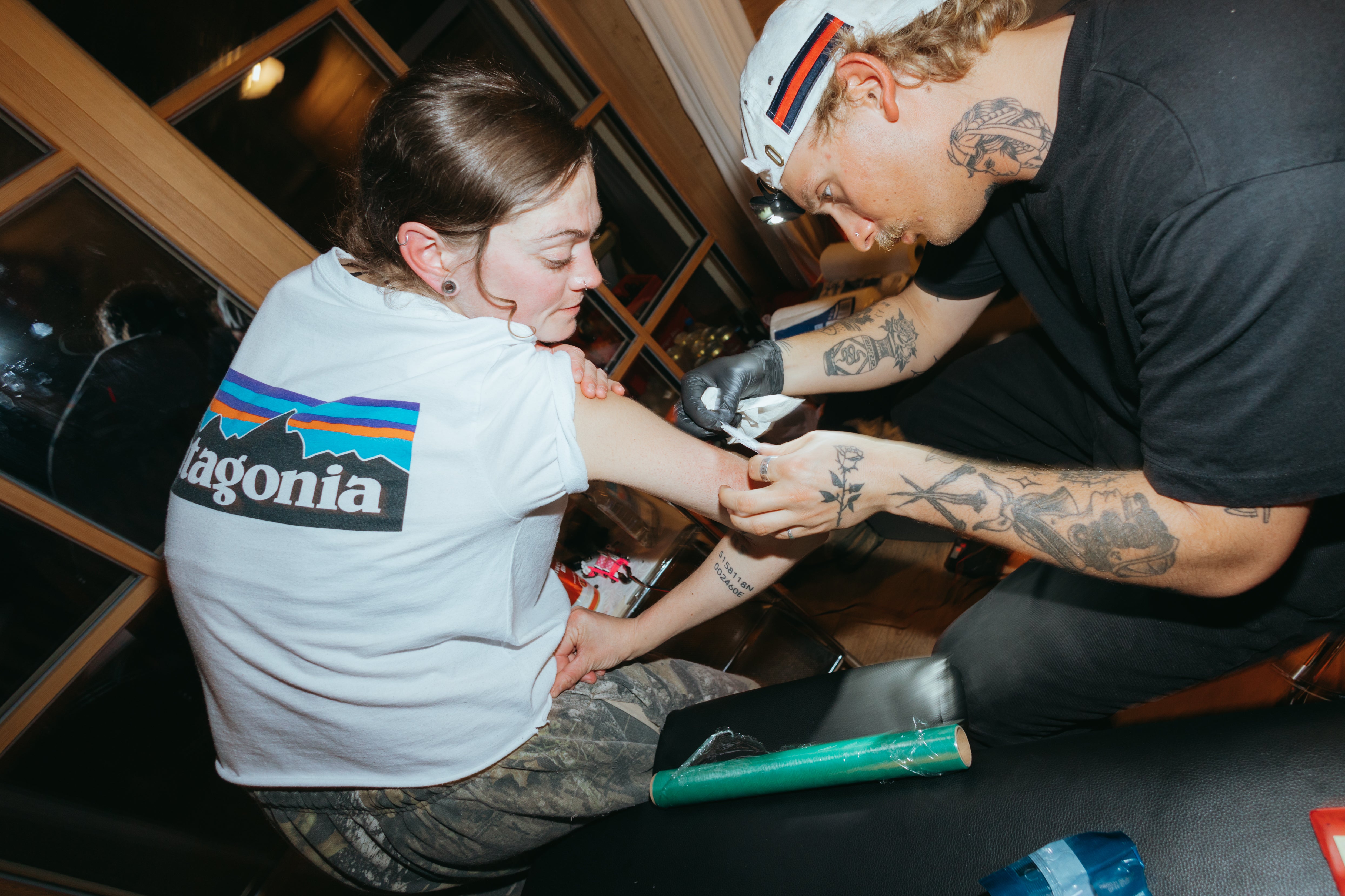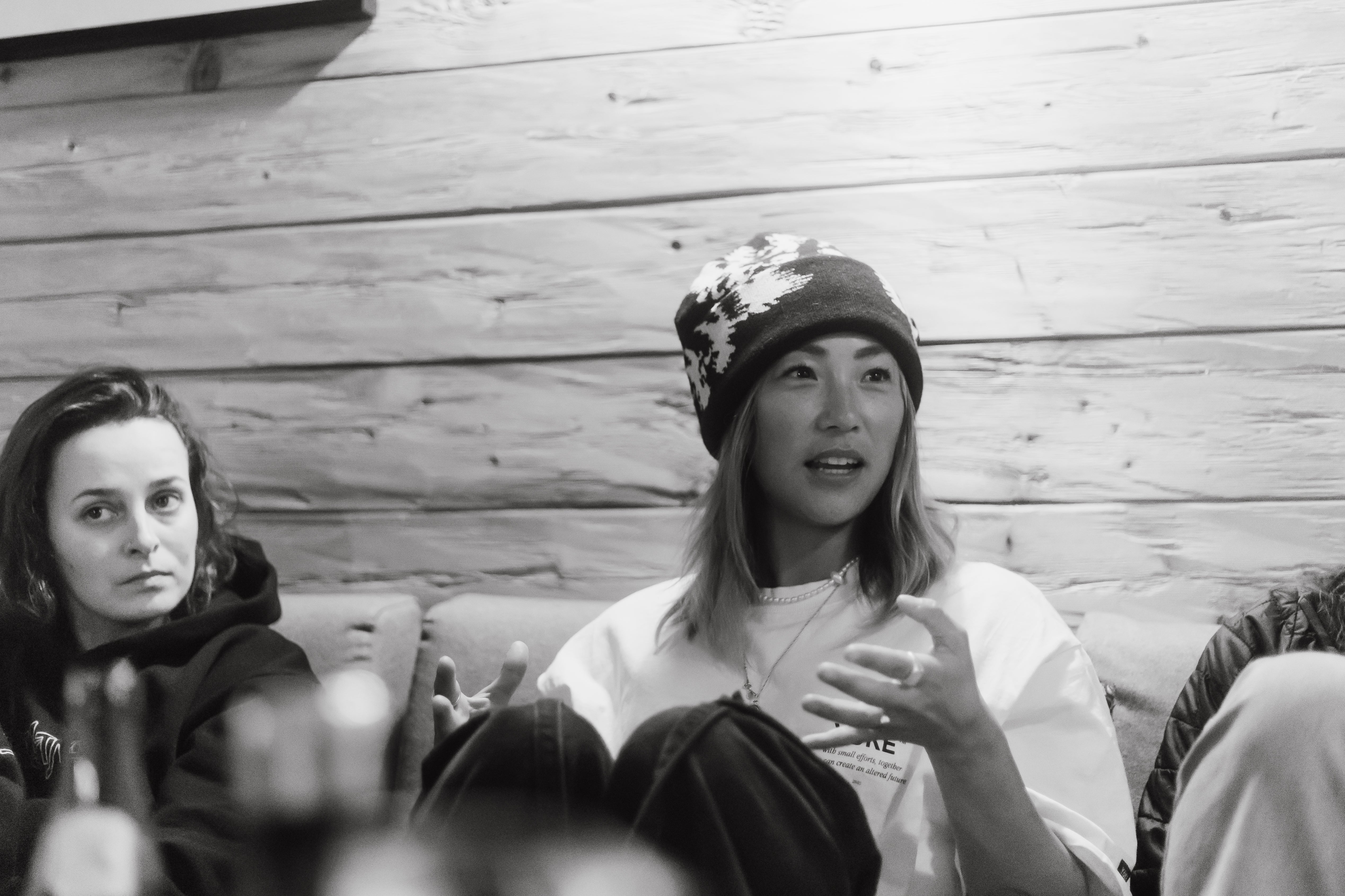 As we are a lot of people and there are a bunch of days, the week is organized into: snowboarding in the mornings and activities in the afternoons: In the morning Craig and Ryan come with us to the ski resort, thus generating footage for the new collection of material, content for us or just boarding. Every afternoon is different: we do an afternoon of snowboarding video-parts, a mental health awareness session with We Are All Mental, Tattoo Party with Niklas, and talks explaining our personal projects: Grlshred, Dolores Magazine, Project Fearless, Recycle+Build and more.